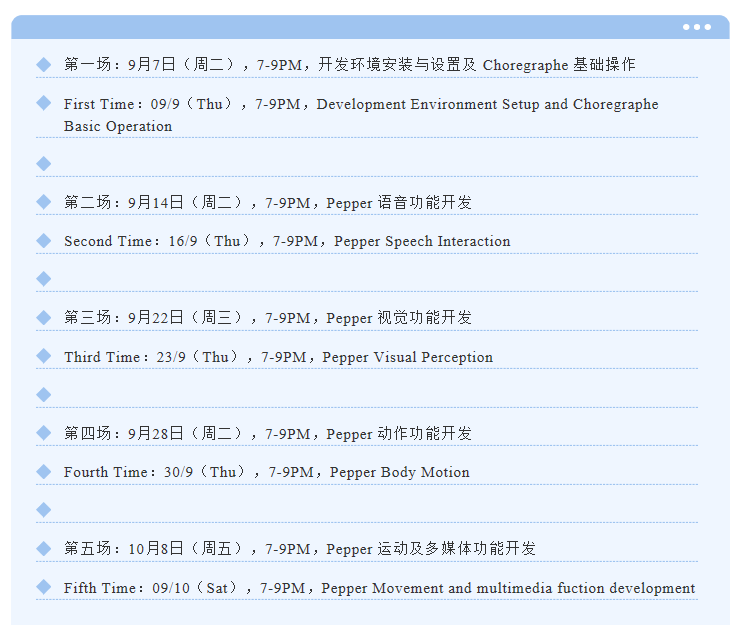 Pepper 智能服务机器人比赛培训将采取线上形式,共计5场,并提供中、英文双语培训资源。