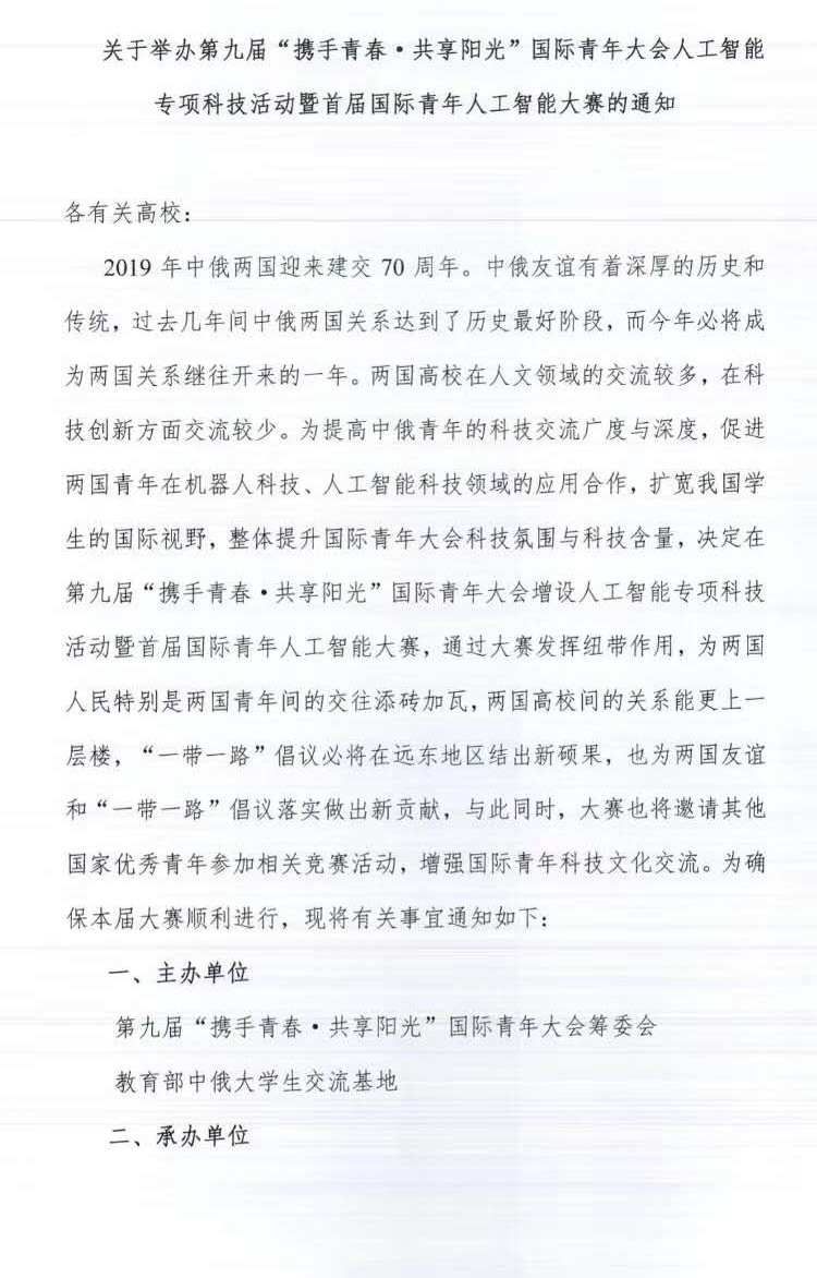 关于举办第九届“携手青春·共享阳光”国际青年大会人工智能专项科技活动暨首届国际青年人工智能大赛的通知